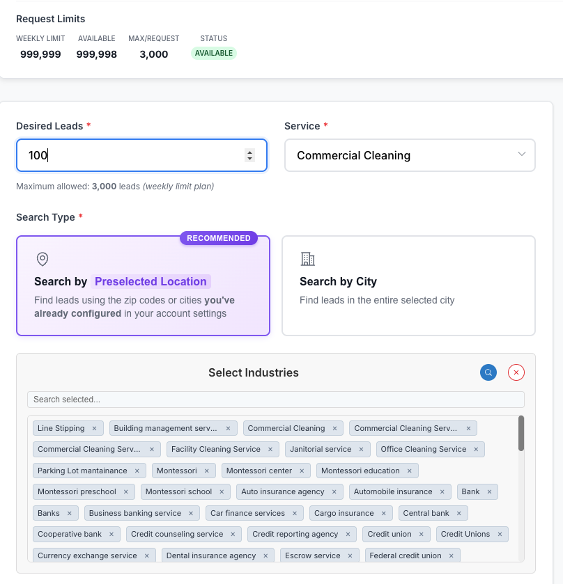 Choose your zip codes or cities, select business types, and click one button.